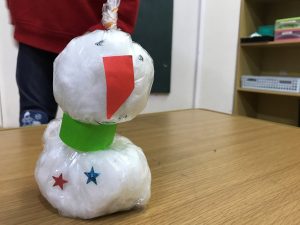 先週の木曜日6日の制作では室内の壁面に使用する雪だるまをみんなで作りましたよ!