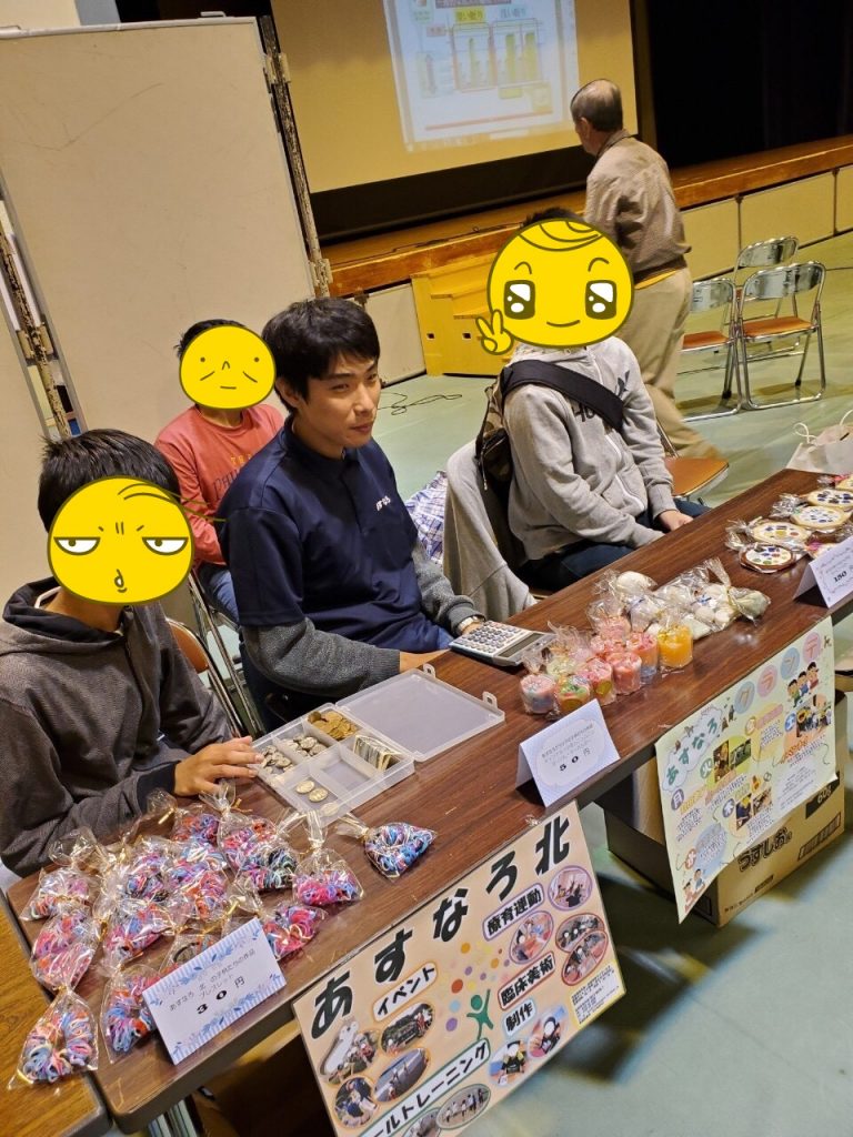 購入して下さった方へ、あすなろ農園で採れたじゃがいもを無料配布しました。先着順に配布してた為、午前中には全てなくなってしまいました。その後も大好評で、コースター完売後も、南の子達は北やグランデの作品を一生懸命販売していました。