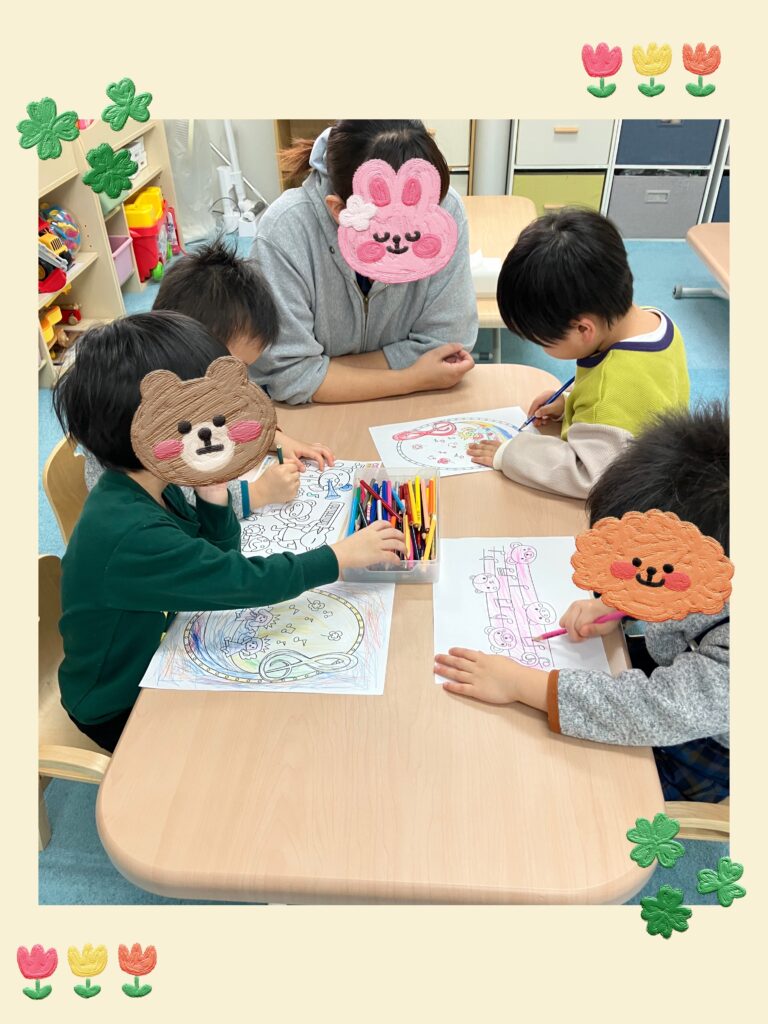 楽器グループが演奏している間、もう一つのグループは別室で音楽に関連する塗り絵をして過ごしています。音符や楽器の塗り絵を沢山の色を使って一生懸命塗っています♪✏️☺️